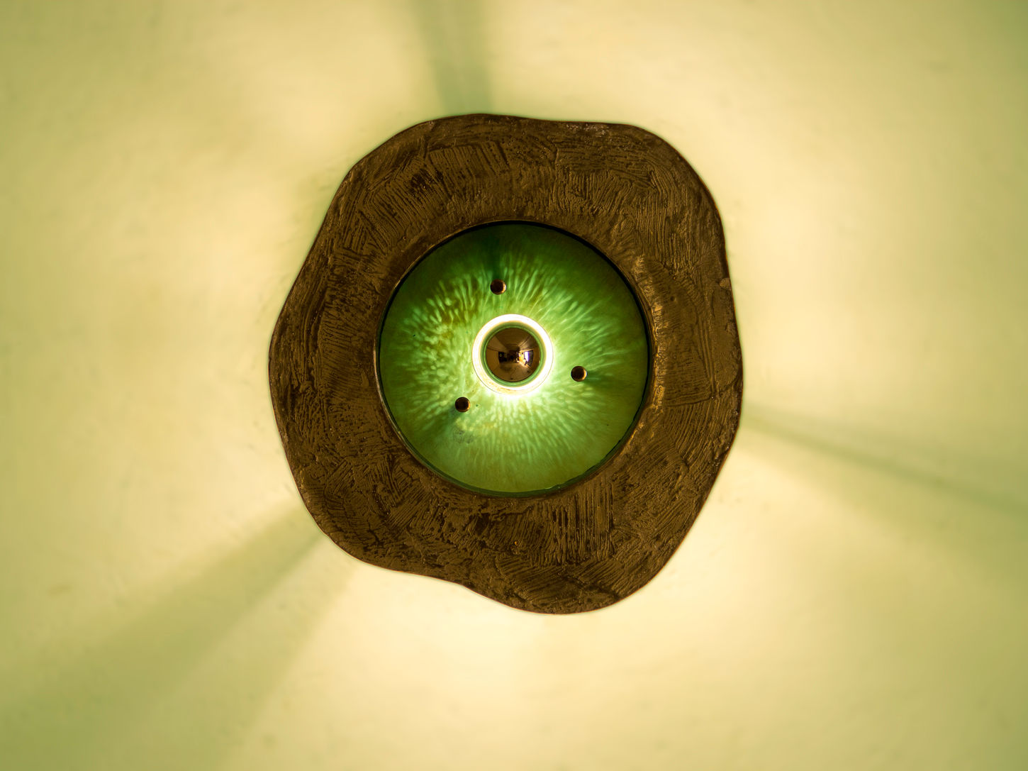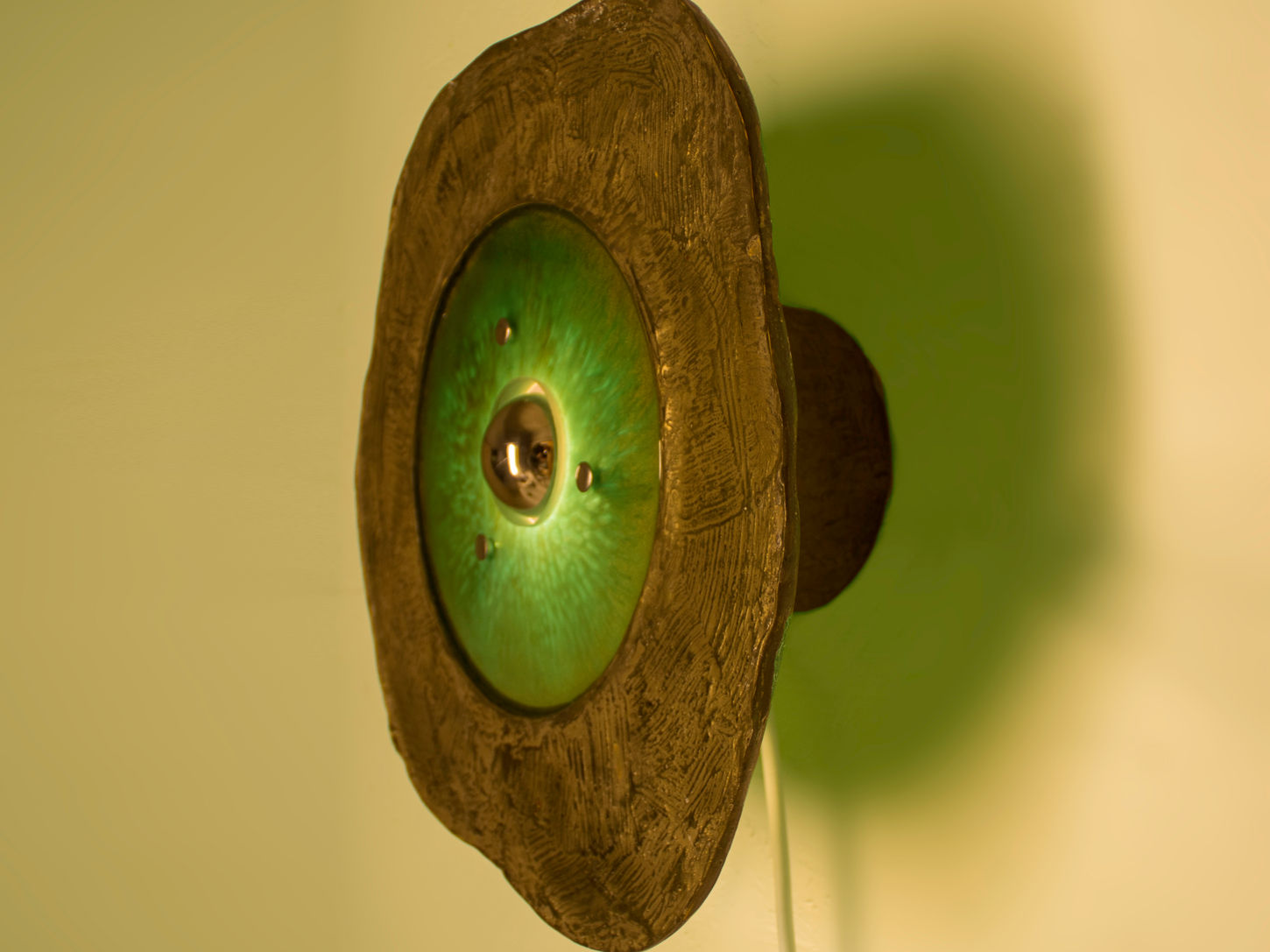 An unusual handmade wall lamp with an organic shape. Consisting of a slab of cast jesmonite and treated with copper powder. In the middle is a circkel made of resin and the colors are made with a special technique. Each lamp is therefore unique.