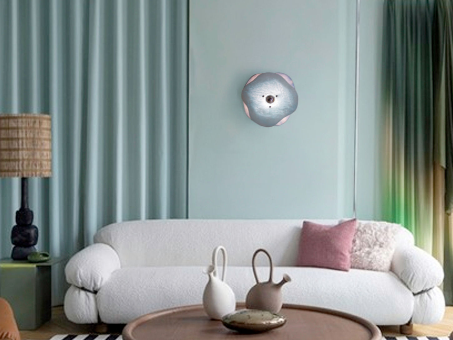 A special handmade wall lamp with an organic shape. Consisting of a back plate cast jesmonite and treated with copper powder. The front plate is flat made of resin and the colors have been created with a special technique. Each lamp is therefore unique.
